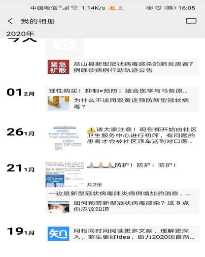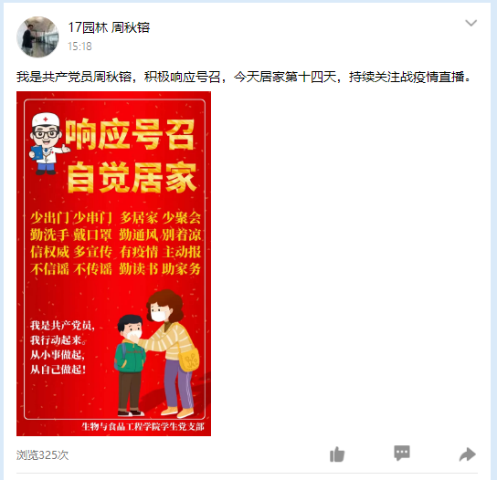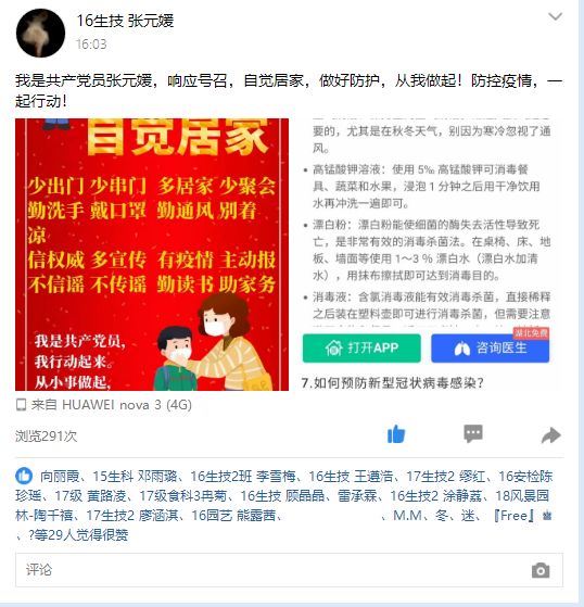 员工党员田慕镕同志在第一时间向武汉捐款,尽绵薄之力,彰党员之风采。同时利用朋友圈宣传官方准确消息,做到不信谣、不传谣。从最初爆出武汉不明原因肺炎,一直心系在鄂同学,主动关心医护朋友,将自己的口罩送给亲戚朋友,用所学医学知识向周围人宣传分享相关预防措施。