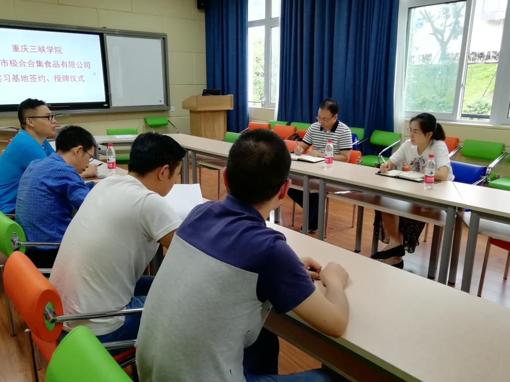 2019年6月17日,437bwin必赢国际与重庆市极合合集食品有限公司共建实习基地的签约授牌仪式在公司举行,重庆市极合合集食品有限公司陈俊逸总监、周玉兰经理和公司经理肖国生、示范中心主任曲留柱、实验室主任唐华丽、学工办主任李华林出席了签约授牌仪式。