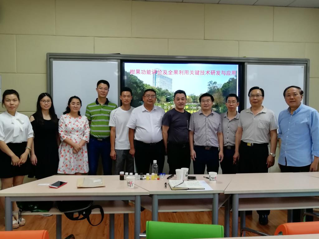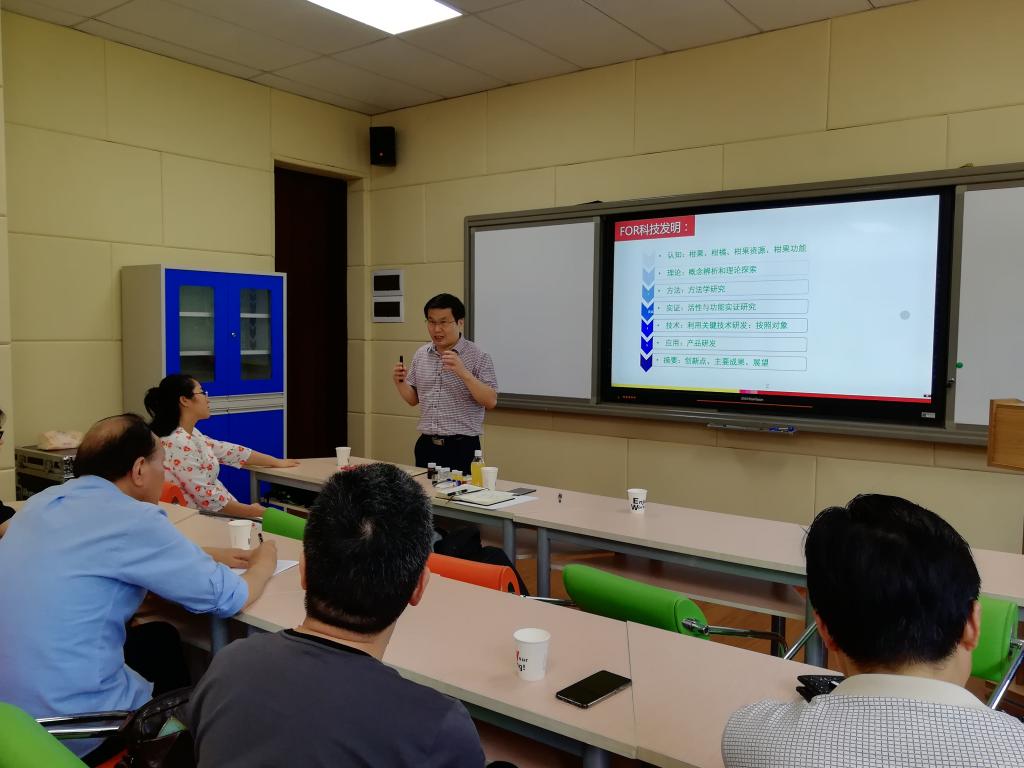 首先,公司副经理周浓就“三峡库区道地药材绿色种植与深加工—重庆市工程实验室”的相关工作情况进行了详细介绍。然后,周志钦教授围绕古红橘产品研发情况,系统介绍了柑橘的概念、营养和对健康的作用、柑橘产业的综合开发和利用等。最后,周教授和与会人员就产品研发和功能评价等方面进行了互动交流。