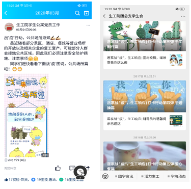 在疫情期间,生工院全体员工,利用QQ、微信等多种线上渠道,分享实时动态、抗疫知识、辟谣等信息,帮助全院员工更好的了解疫情动态,提高认识,为抗疫出力。