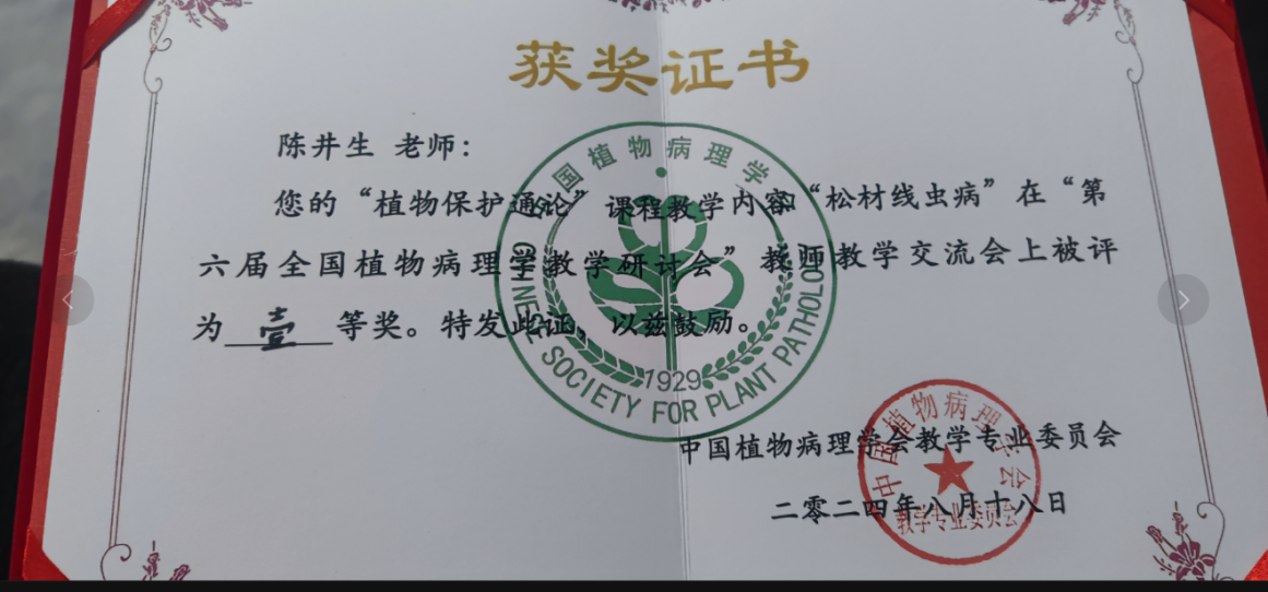 公司陈井生副研究员作为大会唯一地方普通高校参赛代表,以《植物保护通论》课程内容“松材线虫病”参加青年教师教学基本功比赛,从说课、重难点分析、课程内容讲授和课后反思等环节进行了交流,以扎实的教学基本功和较高的教学水平向全国同行展示了公司青年教师的精神风貌,最终荣获一等奖。