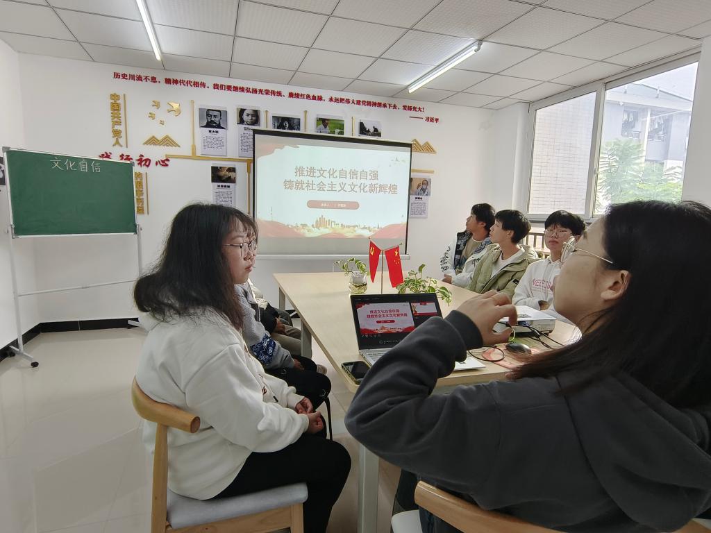活动伊始,许美琳老师以老员工活应该如何度过来破冰,引起同学们的学习兴趣,接着分别从建设具有强大凝聚力和引领力的社会主义意识形态、广泛践行社会主义核心价值观、提高全社会文明程度、繁荣发展文化事业和文化产业、增强中华文明传播力影响力等5个方面讲述如何推进文化自信自强,引导员工努力学习、网络谨慎发言、积极向身边同学宣扬中华优秀文化。学习结束后,同学们积极参与讨论,分享自己的学习心得。