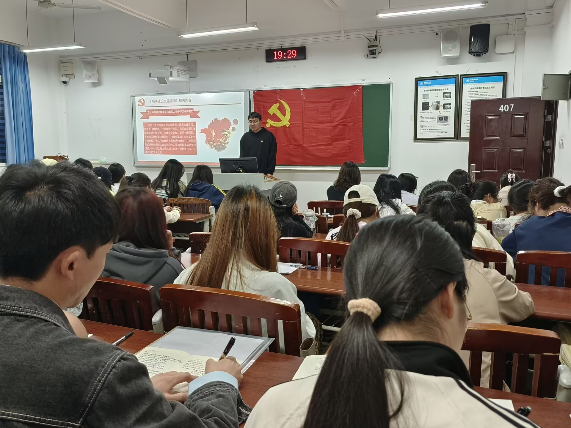 徐国奥同学从坚定不移走中国特色社会主义文化发展道路、着力激发全民族文化创新创造活力、始终坚持文化建设着眼于人落脚于人、在创造性转化和创新性发展中赓续中华文脉、不断提升国家文化软实力和中华文化影响力五个方面详细阐述了文章的主要内容和重要精神。在实践方面,徐国奥同学引导同学们从身边做起,从点滴做起,坚定文化自信,弘扬社会主义核心价值观,提升专业素养,投身文化建设实践。