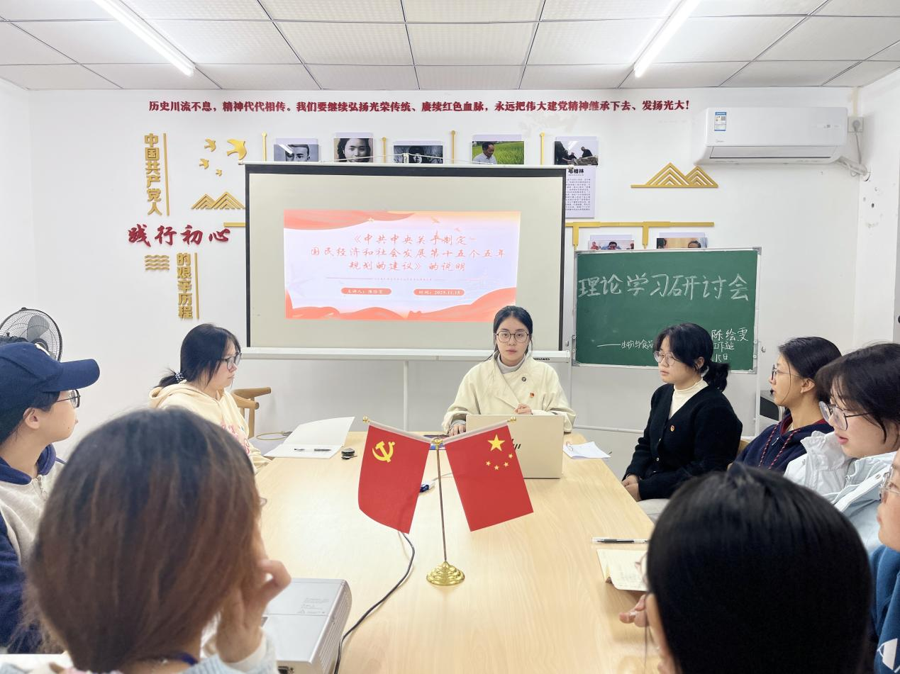 陈绘雯同志围绕文章内容,系统梳理了“十五五”时期经济社会发展的重要目标、指导方针和重点任务,重点阐释了坚持目标导向与问题导向、系统思维、全面深化改革、扩大对外开放等核心内容。她强调,要深刻把握“十五五”时期在基本实现社会主义现代化进程中的关键地位,全面理解高质量发展这一主题,并积极推动各项部署落地见效。在解读“统筹发展和安全”这一精神时,陈绘雯同志结合当前形势,特别强调了反诈骗宣传的重要性,引导大家筑牢安全意识,共同维护校园和社会的和谐稳定。