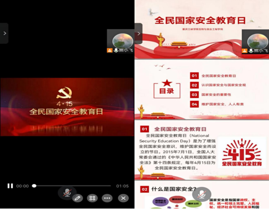首先,辅导员从国家安全基本内容、设立全民国家安全教育日的意义、国家安全的重要性、维护国家安全、人人有责四方面介绍了全民国家安全教育日的有关知识,引导员工增强危机忧患意识、树立总体国家安全观念,在行动上维护国家安全。