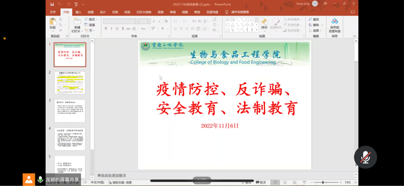 2022年11月6日,公司辅导员分年级开展线上疫情防控、反诈骗、安全教育、法制教育专题周末教育,公司全体员工参与。