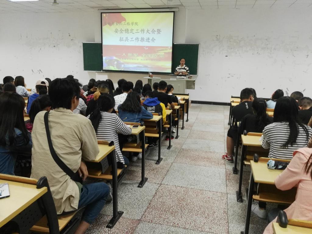 5月10日下午14:20,公司在2教206教室召开了安全稳定工作大会暨征兵工作推进会,全院各班班长、团支书、寝室长参会,学工办副主任李华林主持会议,党总支谭力书记主讲。