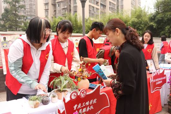 活动开始,社区居民陆续来到宣讲区,阅读盆栽养护知识宣传海报,欣赏绿植花卉、花艺成品。园艺专业同学耐心解答居民提出的绿植养护问题,并分享植物栽培实用方法及花艺制作小技巧。同时志愿者与居民相互交流,双方都收获良多,现场气氛十分活跃。此外,风景园林专业志愿者现场进行微景观制作,细心与居民讲解制作流程、注意事项以及后续护理知识,现场制作非常成功。最后各志愿服务团队合影留念,纪念此次文明实践示范活动工作圆满完成。