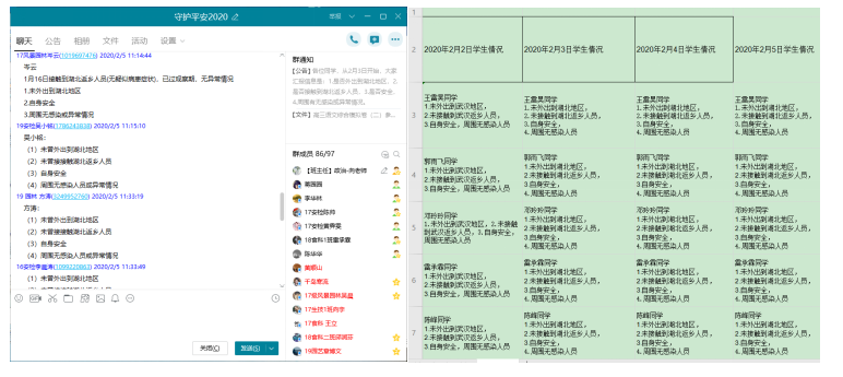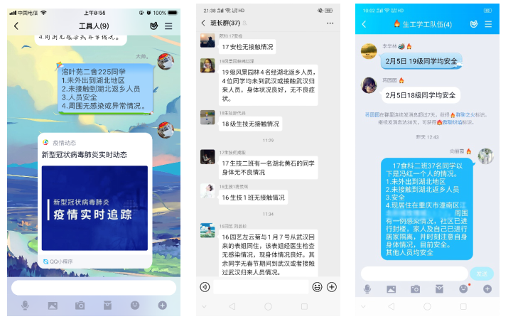根据前期掌握的员工情况和公司调查问卷反馈情况,筛查重点关注人群,一对一进行电话和QQ排查,建立信息台账。建立QQ群“守护平安2020”,将(1)湖北籍员工;(2)途径湖北地区的员工;(3)接触过湖北地区返乡人员的员工;(4)周边有疑似新型冠状病毒肺炎病例感染人群的员工;(5)健康状况为其它员工,列为重点关注对象,建立每日信息台账,各年级由专人负责监督和跟踪信息,每日下午13:00汇报年级辅导员。持续汇报第9天,未有新冠肺炎疑似症状的员工。