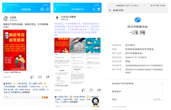 (1)员工党员利用网络新媒体,积极配合公司完成调查问卷,在QQ空间、QQ群、朋友圈等网络平台分享疫情实时动态,宣传防疫知识等。时刻关心同学动态,配合公司彻底摸底排查梳理,以自身防疫为先,号召公司同学为抵御疫情献上绵薄之力,切实发挥好党员先锋模范作用。员工党员田慕镕同志在第一时间向武汉捐款,尽绵薄之力。