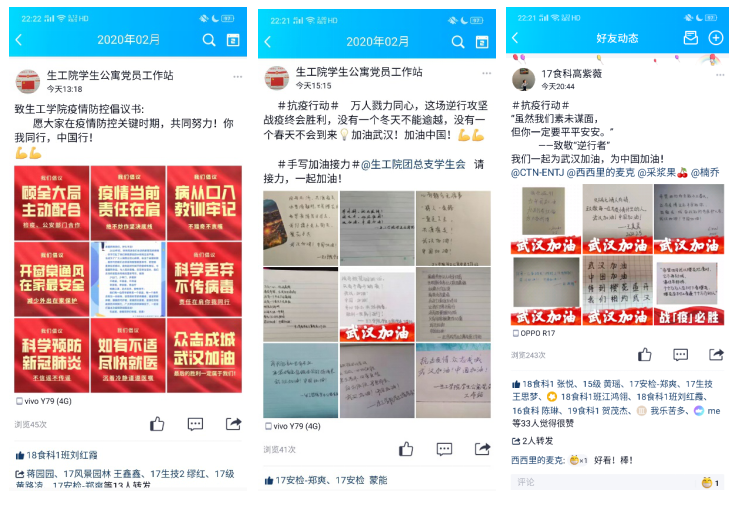 (2)员工公寓党员工作站通过官方QQ发布“老员工疫情防控倡议书”,引导同学们关注自身健康,做好疫情防护措施,积极响应国家号召,做到不造谣,不信谣,不传谣。线上开展“手动加油接力”活动,为“抗疫行动”加油,致敬奋战在一线抗击肺炎的所有工作者。