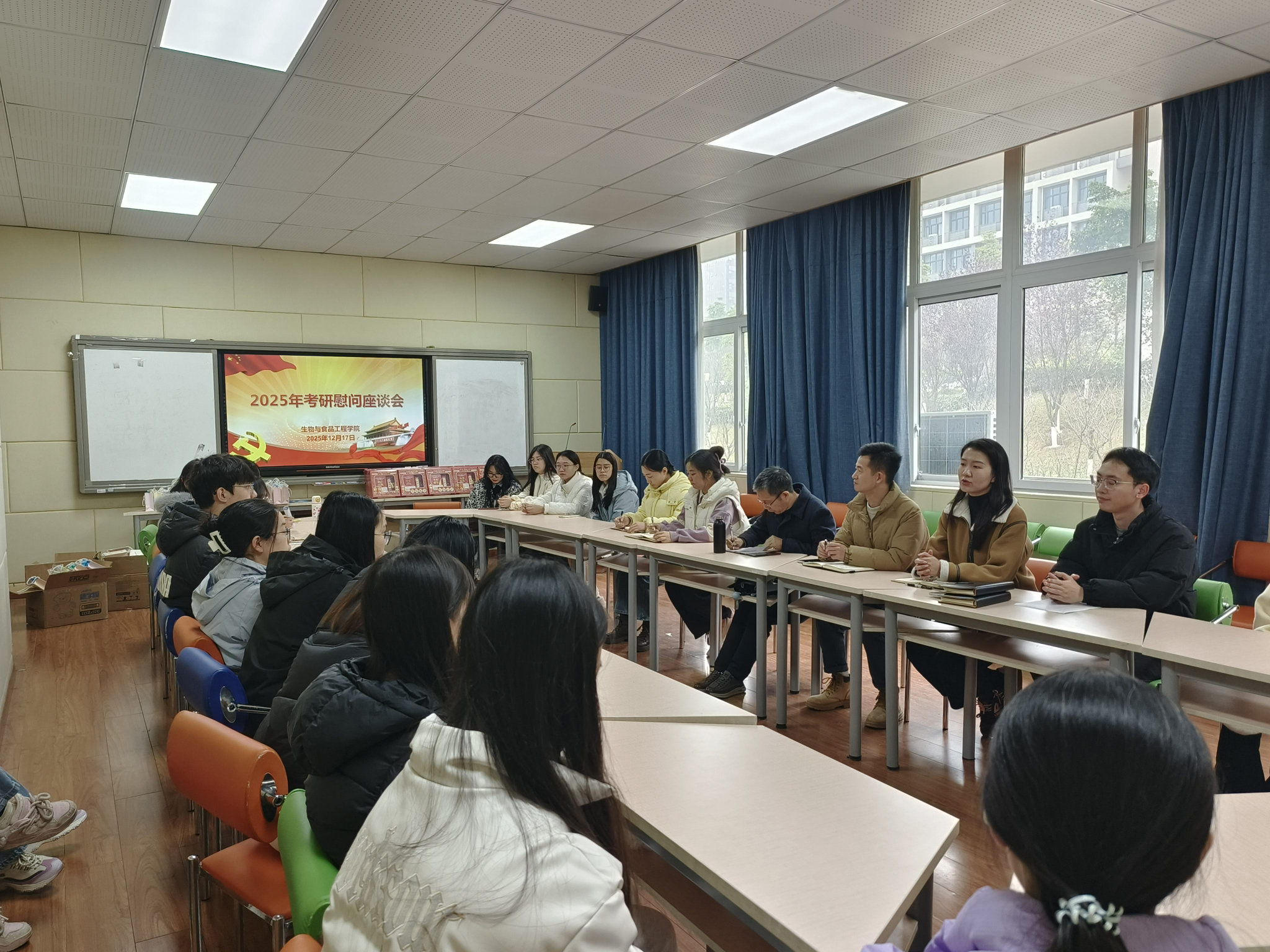 为鼓励考研学子,缓解备考压力,公司于12月17日上午在慎思楼2-216教室开展2026届考研学子慰问活动。党总支书记肖国生、全体辅导员及考研员工代表参加。