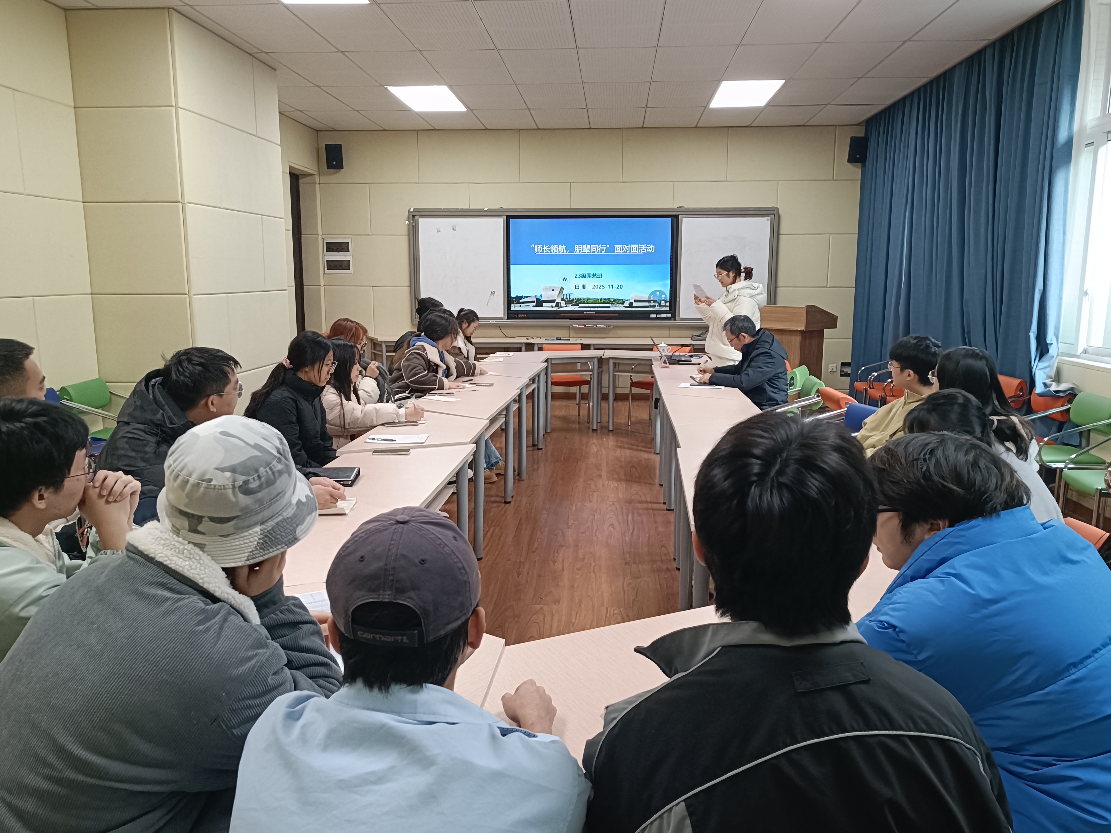 2025年11月20日,公司在慎思楼2栋216会议室开展“师长领航,朋辈同行”领导干部联系班级活动,公司党总支书记肖国生和23级园艺班参加。