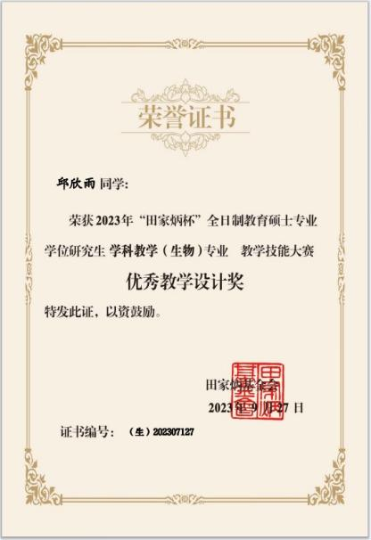 9月27日,全国“田家炳杯”全日制教育硕士专业学位研究生学科教学(生物)专业教学技能大赛决赛在鲁东大学落下帷幕。公司学科教学(生物)专业研究生赵雪雯获二等奖、周泓希获三等奖、邱欣雨获优秀教学设计奖。