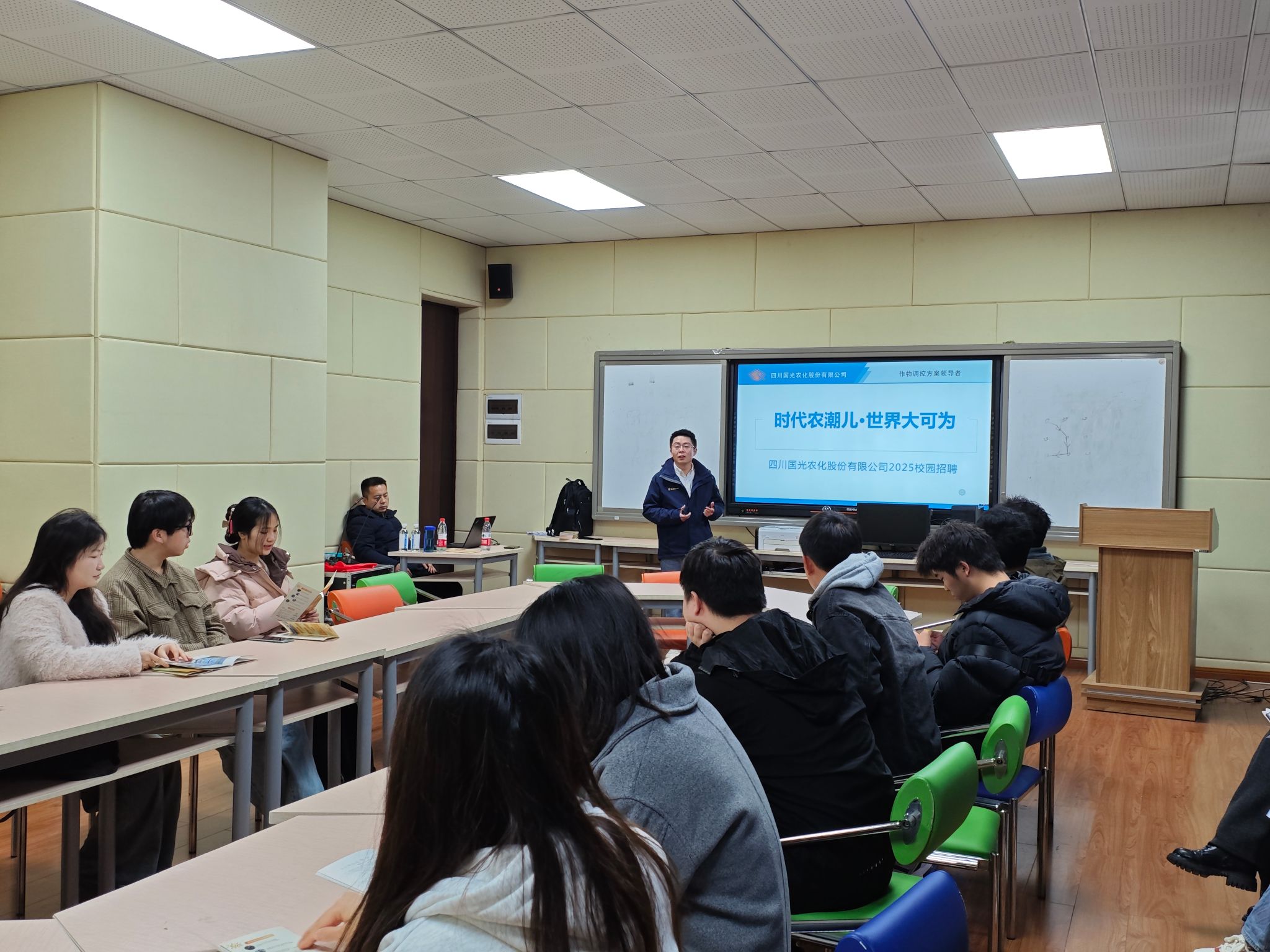 为搭建校企供需对接平台,推动人才培养与产业需求精准衔接,2025年3月14日,四川国光农业科技有限公司受邀走进437bwin必赢国际,开展“企业进校园”校企合作交流暨专场招聘活动。生工公司党总支书记骆孟鑫、副书记陈文剑、学工办主任闫兴运及数十名师生代表参与活动,四川国光农业人力资源经理张兴代表企业到校对接洽谈。